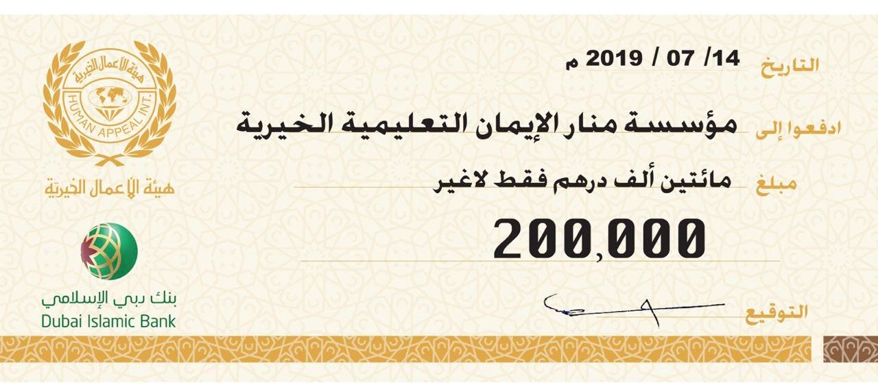 قدمت هيئة الأعمال الخيرية دعما ماديا بقيمة 200 ألف درهم لمدرسة منار الإيمان الخيرية بعجمان مخصص لطلاب العلم المتعثرين والمحتاجين، لمدرسة، مساهمة منها لطلاب العلم، وانطلاقا من استراتيجية القيادة العليا بشأن دعم البرامج التعليمية.